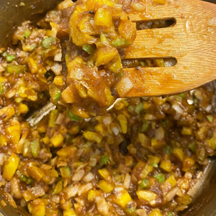 Now add chopped bell peppers, celery sticks and an onion to the mixture. Cook until the veggies are soft.